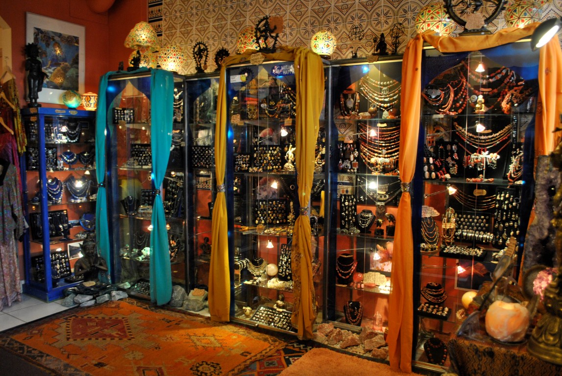 Ik drentel langs de glazen kasten en uitstallingen, hangers met veel zacht glanzend zilver, op kleur gerangschikt naar steen. Groene jade, rozenkwarts en zwarte stenen die ik niet herken . Mooie zijden sjaals, ze voelen soepel en zacht en minstens honderd van die geurbrandertjes. Een meneer in een paars colbert vraagt om een hanger in de etalage en de verkoopster klimt als een slangenmens tussen de velours lappen en boeddhistische beelden om de hanger uit de opstelling te vissen.